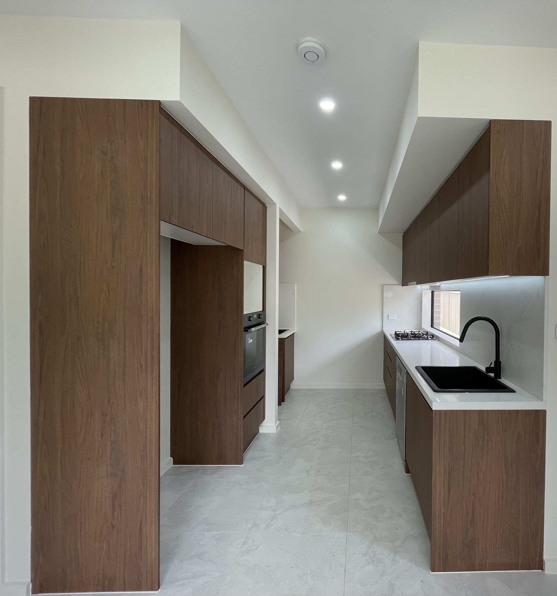 -Modern kitchen with gas appliances and stone bench tops